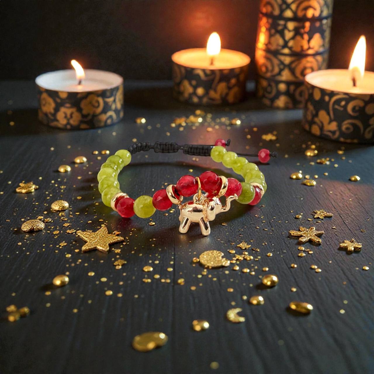 Elementul central în formă de elefant auriu, simbol tradițional al norocului și stabilității, completează această brățară ca talisman de protecție și prosperitate, asociat cu succesul și împlinirea pe termen lung.